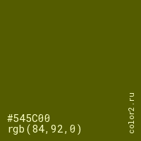 Цвет #545C00 в цветовой модели RGB обозначается тремя октетами (84, 92, 0) в десятичном формате и #545C00 в шестнадцатиричном (hex) формате, которые являются интенсивностью красного 84 (hex 54), интенсивность зелёного 92 (hex 5C) и интенсивность синего 0 (hex 00).