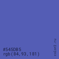 Цвет #545DB5 в цветовой модели RGB обозначается тремя октетами (84, 93, 181) в десятичном формате и #545DB5 в шестнадцатиричном (hex) формате, которые являются интенсивностью красного 84 (hex 54), интенсивность зелёного 93 (hex 5D) и интенсивность синего 181 (hex B5).