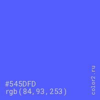 Цвет #545DFD в цветовой модели RGB обозначается тремя октетами (84, 93, 253) в десятичном формате и #545DFD в шестнадцатиричном (hex) формате, которые являются интенсивностью красного 84 (hex 54), интенсивность зелёного 93 (hex 5D) и интенсивность синего 253 (hex FD).