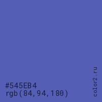 Цвет #545EB4 в цветовой модели RGB обозначается тремя октетами (84, 94, 180) в десятичном формате и #545EB4 в шестнадцатиричном (hex) формате, которые являются интенсивностью красного 84 (hex 54), интенсивность зелёного 94 (hex 5E) и интенсивность синего 180 (hex B4).