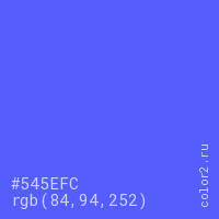 Цвет #545EFC в цветовой модели RGB обозначается тремя октетами (84, 94, 252) в десятичном формате и #545EFC в шестнадцатиричном (hex) формате, которые являются интенсивностью красного 84 (hex 54), интенсивность зелёного 94 (hex 5E) и интенсивность синего 252 (hex FC).