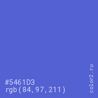 Цвет #5461D3 в цветовой модели RGB обозначается тремя октетами (84, 97, 211) в десятичном формате и #5461D3 в шестнадцатиричном (hex) формате, которые являются интенсивностью красного 84 (hex 54), интенсивность зелёного 97 (hex 61) и интенсивность синего 211 (hex D3).