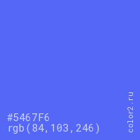 Цвет #5467F6 в цветовой модели RGB обозначается тремя октетами (84, 103, 246) в десятичном формате и #5467F6 в шестнадцатиричном (hex) формате, которые являются интенсивностью красного 84 (hex 54), интенсивность зелёного 103 (hex 67) и интенсивность синего 246 (hex F6).