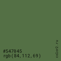 Цвет #547045 в цветовой модели RGB обозначается тремя октетами (84, 112, 69) в десятичном формате и #547045 в шестнадцатиричном (hex) формате, которые являются интенсивностью красного 84 (hex 54), интенсивность зелёного 112 (hex 70) и интенсивность синего 69 (hex 45).