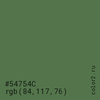 Цвет #54754C в цветовой модели RGB обозначается тремя октетами (84, 117, 76) в десятичном формате и #54754C в шестнадцатиричном (hex) формате, которые являются интенсивностью красного 84 (hex 54), интенсивность зелёного 117 (hex 75) и интенсивность синего 76 (hex 4C).