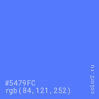 Цвет #5479FC в цветовой модели RGB обозначается тремя октетами (84, 121, 252) в десятичном формате и #5479FC в шестнадцатиричном (hex) формате, которые являются интенсивностью красного 84 (hex 54), интенсивность зелёного 121 (hex 79) и интенсивность синего 252 (hex FC).