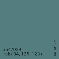 Цвет #547D80 в цветовой модели RGB обозначается тремя октетами (84, 125, 128) в десятичном формате и #547D80 в шестнадцатиричном (hex) формате, которые являются интенсивностью красного 84 (hex 54), интенсивность зелёного 125 (hex 7D) и интенсивность синего 128 (hex 80).