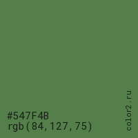 Цвет #547F4B в цветовой модели RGB обозначается тремя октетами (84, 127, 75) в десятичном формате и #547F4B в шестнадцатиричном (hex) формате, которые являются интенсивностью красного 84 (hex 54), интенсивность зелёного 127 (hex 7F) и интенсивность синего 75 (hex 4B).