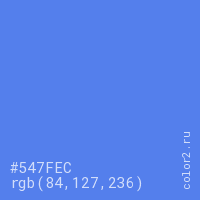 Цвет #547FEC в цветовой модели RGB обозначается тремя октетами (84, 127, 236) в десятичном формате и #547FEC в шестнадцатиричном (hex) формате, которые являются интенсивностью красного 84 (hex 54), интенсивность зелёного 127 (hex 7F) и интенсивность синего 236 (hex EC).