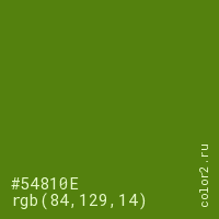 Цвет #54810E в цветовой модели RGB обозначается тремя октетами (84, 129, 14) в десятичном формате и #54810E в шестнадцатиричном (hex) формате, которые являются интенсивностью красного 84 (hex 54), интенсивность зелёного 129 (hex 81) и интенсивность синего 14 (hex 0E).