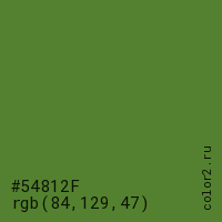 Цвет #54812F в цветовой модели RGB обозначается тремя октетами (84, 129, 47) в десятичном формате и #54812F в шестнадцатиричном (hex) формате, которые являются интенсивностью красного 84 (hex 54), интенсивность зелёного 129 (hex 81) и интенсивность синего 47 (hex 2F).