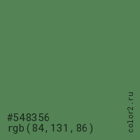 Цвет #548356 в цветовой модели RGB обозначается тремя октетами (84, 131, 86) в десятичном формате и #548356 в шестнадцатиричном (hex) формате, которые являются интенсивностью красного 84 (hex 54), интенсивность зелёного 131 (hex 83) и интенсивность синего 86 (hex 56).