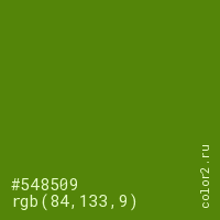 Цвет #548509 в цветовой модели RGB обозначается тремя октетами (84, 133, 9) в десятичном формате и #548509 в шестнадцатиричном (hex) формате, которые являются интенсивностью красного 84 (hex 54), интенсивность зелёного 133 (hex 85) и интенсивность синего 9 (hex 09).