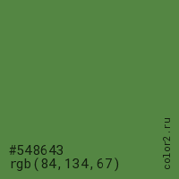Цвет #548643 в цветовой модели RGB обозначается тремя октетами (84, 134, 67) в десятичном формате и #548643 в шестнадцатиричном (hex) формате, которые являются интенсивностью красного 84 (hex 54), интенсивность зелёного 134 (hex 86) и интенсивность синего 67 (hex 43).