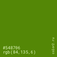 Цвет #548706 в цветовой модели RGB обозначается тремя октетами (84, 135, 6) в десятичном формате и #548706 в шестнадцатиричном (hex) формате, которые являются интенсивностью красного 84 (hex 54), интенсивность зелёного 135 (hex 87) и интенсивность синего 6 (hex 06).