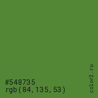 Цвет #548735 в цветовой модели RGB обозначается тремя октетами (84, 135, 53) в десятичном формате и #548735 в шестнадцатиричном (hex) формате, которые являются интенсивностью красного 84 (hex 54), интенсивность зелёного 135 (hex 87) и интенсивность синего 53 (hex 35).