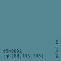 Цвет #548892 в цветовой модели RGB обозначается тремя октетами (84, 136, 146) в десятичном формате и #548892 в шестнадцатиричном (hex) формате, которые являются интенсивностью красного 84 (hex 54), интенсивность зелёного 136 (hex 88) и интенсивность синего 146 (hex 92).