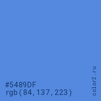 Цвет #5489DF в цветовой модели RGB обозначается тремя октетами (84, 137, 223) в десятичном формате и #5489DF в шестнадцатиричном (hex) формате, которые являются интенсивностью красного 84 (hex 54), интенсивность зелёного 137 (hex 89) и интенсивность синего 223 (hex DF).