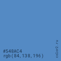 Цвет #548AC4 в цветовой модели RGB обозначается тремя октетами (84, 138, 196) в десятичном формате и #548AC4 в шестнадцатиричном (hex) формате, которые являются интенсивностью красного 84 (hex 54), интенсивность зелёного 138 (hex 8A) и интенсивность синего 196 (hex C4).