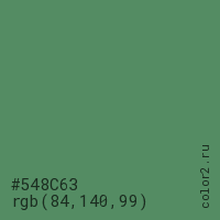 Цвет #548C63 в цветовой модели RGB обозначается тремя октетами (84, 140, 99) в десятичном формате и #548C63 в шестнадцатиричном (hex) формате, которые являются интенсивностью красного 84 (hex 54), интенсивность зелёного 140 (hex 8C) и интенсивность синего 99 (hex 63).