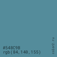 Цвет #548C9B в цветовой модели RGB обозначается тремя октетами (84, 140, 155) в десятичном формате и #548C9B в шестнадцатиричном (hex) формате, которые являются интенсивностью красного 84 (hex 54), интенсивность зелёного 140 (hex 8C) и интенсивность синего 155 (hex 9B).