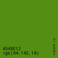 Цвет #548E12 в цветовой модели RGB обозначается тремя октетами (84, 142, 18) в десятичном формате и #548E12 в шестнадцатиричном (hex) формате, которые являются интенсивностью красного 84 (hex 54), интенсивность зелёного 142 (hex 8E) и интенсивность синего 18 (hex 12).