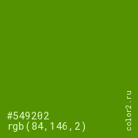 Цвет #549202 в цветовой модели RGB обозначается тремя октетами (84, 146, 2) в десятичном формате и #549202 в шестнадцатиричном (hex) формате, которые являются интенсивностью красного 84 (hex 54), интенсивность зелёного 146 (hex 92) и интенсивность синего 2 (hex 02).