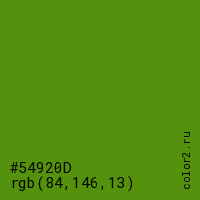 Цвет #54920D в цветовой модели RGB обозначается тремя октетами (84, 146, 13) в десятичном формате и #54920D в шестнадцатиричном (hex) формате, которые являются интенсивностью красного 84 (hex 54), интенсивность зелёного 146 (hex 92) и интенсивность синего 13 (hex 0D).
