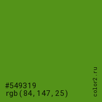 Цвет #549319 в цветовой модели RGB обозначается тремя октетами (84, 147, 25) в десятичном формате и #549319 в шестнадцатиричном (hex) формате, которые являются интенсивностью красного 84 (hex 54), интенсивность зелёного 147 (hex 93) и интенсивность синего 25 (hex 19).