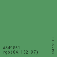 Цвет #549861 в цветовой модели RGB обозначается тремя октетами (84, 152, 97) в десятичном формате и #549861 в шестнадцатиричном (hex) формате, которые являются интенсивностью красного 84 (hex 54), интенсивность зелёного 152 (hex 98) и интенсивность синего 97 (hex 61).