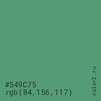 Цвет #549C75 в цветовой модели RGB обозначается тремя октетами (84, 156, 117) в десятичном формате и #549C75 в шестнадцатиричном (hex) формате, которые являются интенсивностью красного 84 (hex 54), интенсивность зелёного 156 (hex 9C) и интенсивность синего 117 (hex 75).