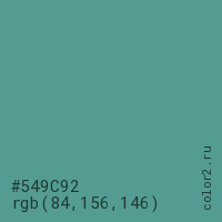 Цвет #549C92 в цветовой модели RGB обозначается тремя октетами (84, 156, 146) в десятичном формате и #549C92 в шестнадцатиричном (hex) формате, которые являются интенсивностью красного 84 (hex 54), интенсивность зелёного 156 (hex 9C) и интенсивность синего 146 (hex 92).