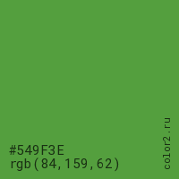 Цвет #549F3E в цветовой модели RGB обозначается тремя октетами (84, 159, 62) в десятичном формате и #549F3E в шестнадцатиричном (hex) формате, которые являются интенсивностью красного 84 (hex 54), интенсивность зелёного 159 (hex 9F) и интенсивность синего 62 (hex 3E).