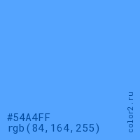 Цвет #54A4FF в цветовой модели RGB обозначается тремя октетами (84, 164, 255) в десятичном формате и #54A4FF в шестнадцатиричном (hex) формате, которые являются интенсивностью красного 84 (hex 54), интенсивность зелёного 164 (hex A4) и интенсивность синего 255 (hex FF).