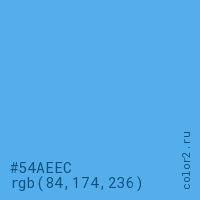 Цвет #54AEEC в цветовой модели RGB обозначается тремя октетами (84, 174, 236) в десятичном формате и #54AEEC в шестнадцатиричном (hex) формате, которые являются интенсивностью красного 84 (hex 54), интенсивность зелёного 174 (hex AE) и интенсивность синего 236 (hex EC).