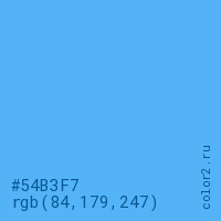 Цвет #54B3F7 в цветовой модели RGB обозначается тремя октетами (84, 179, 247) в десятичном формате и #54B3F7 в шестнадцатиричном (hex) формате, которые являются интенсивностью красного 84 (hex 54), интенсивность зелёного 179 (hex B3) и интенсивность синего 247 (hex F7).
