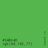 Цвет #54B64D в цветовой модели RGB обозначается тремя октетами (84, 182, 77) в десятичном формате и #54B64D в шестнадцатиричном (hex) формате, которые являются интенсивностью красного 84 (hex 54), интенсивность зелёного 182 (hex B6) и интенсивность синего 77 (hex 4D).