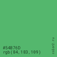 Цвет #54B76D в цветовой модели RGB обозначается тремя октетами (84, 183, 109) в десятичном формате и #54B76D в шестнадцатиричном (hex) формате, которые являются интенсивностью красного 84 (hex 54), интенсивность зелёного 183 (hex B7) и интенсивность синего 109 (hex 6D).
