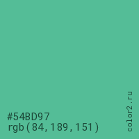Цвет #54BD97 в цветовой модели RGB обозначается тремя октетами (84, 189, 151) в десятичном формате и #54BD97 в шестнадцатиричном (hex) формате, которые являются интенсивностью красного 84 (hex 54), интенсивность зелёного 189 (hex BD) и интенсивность синего 151 (hex 97).