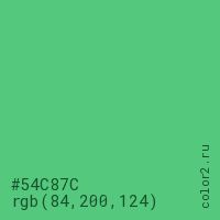 Цвет #54C87C в цветовой модели RGB обозначается тремя октетами (84, 200, 124) в десятичном формате и #54C87C в шестнадцатиричном (hex) формате, которые являются интенсивностью красного 84 (hex 54), интенсивность зелёного 200 (hex C8) и интенсивность синего 124 (hex 7C).