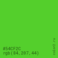 Цвет #54CF2C в цветовой модели RGB обозначается тремя октетами (84, 207, 44) в десятичном формате и #54CF2C в шестнадцатиричном (hex) формате, которые являются интенсивностью красного 84 (hex 54), интенсивность зелёного 207 (hex CF) и интенсивность синего 44 (hex 2C).