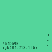 Цвет #54D59B в цветовой модели RGB обозначается тремя октетами (84, 213, 155) в десятичном формате и #54D59B в шестнадцатиричном (hex) формате, которые являются интенсивностью красного 84 (hex 54), интенсивность зелёного 213 (hex D5) и интенсивность синего 155 (hex 9B).