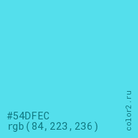 Цвет #54DFEC в цветовой модели RGB обозначается тремя октетами (84, 223, 236) в десятичном формате и #54DFEC в шестнадцатиричном (hex) формате, которые являются интенсивностью красного 84 (hex 54), интенсивность зелёного 223 (hex DF) и интенсивность синего 236 (hex EC).
