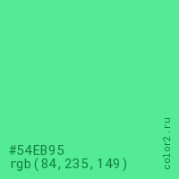 Цвет #54EB95 в цветовой модели RGB обозначается тремя октетами (84, 235, 149) в десятичном формате и #54EB95 в шестнадцатиричном (hex) формате, которые являются интенсивностью красного 84 (hex 54), интенсивность зелёного 235 (hex EB) и интенсивность синего 149 (hex 95).