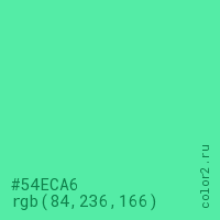 Цвет #54ECA6 в цветовой модели RGB обозначается тремя октетами (84, 236, 166) в десятичном формате и #54ECA6 в шестнадцатиричном (hex) формате, которые являются интенсивностью красного 84 (hex 54), интенсивность зелёного 236 (hex EC) и интенсивность синего 166 (hex A6).