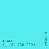 Цвет #54ECEF в цветовой модели RGB обозначается тремя октетами (84, 236, 239) в десятичном формате и #54ECEF в шестнадцатиричном (hex) формате, которые являются интенсивностью красного 84 (hex 54), интенсивность зелёного 236 (hex EC) и интенсивность синего 239 (hex EF).