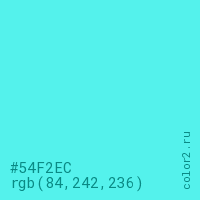 Цвет #54F2EC в цветовой модели RGB обозначается тремя октетами (84, 242, 236) в десятичном формате и #54F2EC в шестнадцатиричном (hex) формате, которые являются интенсивностью красного 84 (hex 54), интенсивность зелёного 242 (hex F2) и интенсивность синего 236 (hex EC).
