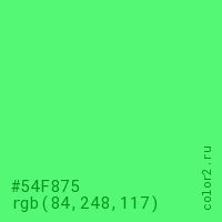 Цвет #54F875 в цветовой модели RGB обозначается тремя октетами (84, 248, 117) в десятичном формате и #54F875 в шестнадцатиричном (hex) формате, которые являются интенсивностью красного 84 (hex 54), интенсивность зелёного 248 (hex F8) и интенсивность синего 117 (hex 75).