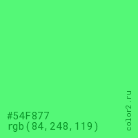 Цвет #54F877 в цветовой модели RGB обозначается тремя октетами (84, 248, 119) в десятичном формате и #54F877 в шестнадцатиричном (hex) формате, которые являются интенсивностью красного 84 (hex 54), интенсивность зелёного 248 (hex F8) и интенсивность синего 119 (hex 77).