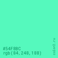 Цвет #54F8BC в цветовой модели RGB обозначается тремя октетами (84, 248, 188) в десятичном формате и #54F8BC в шестнадцатиричном (hex) формате, которые являются интенсивностью красного 84 (hex 54), интенсивность зелёного 248 (hex F8) и интенсивность синего 188 (hex BC).